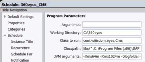 It was also possible to overwrite some of these parameters by adding them to a job's Arguments textfield in the CMC or the BI LaunchPad with a leading dash. For instance, the "cms.content=FOLDER, DOCUMENT" parameter in the "360eyes.param" file could be overwritten in the job configuration with "-cms.content=FOLDER" in the Arguments textfield.
