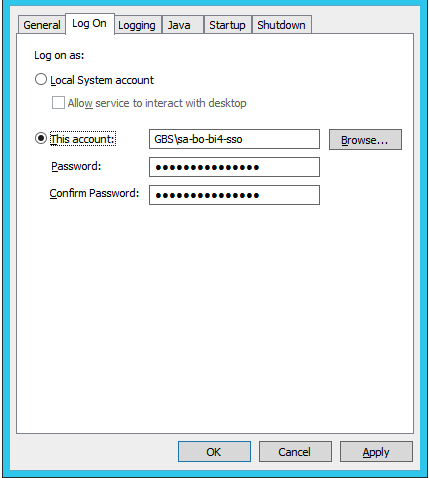 3. Navigate to the Log On tab and enter the AD Service Account Tomcat will use: